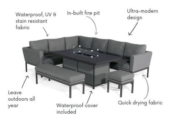 Product Dimensions | Type:Luxury garden furniture Frame:Aluminum Material:All weather fabric Long Side Size:W284 x D88 x H90cm Short Side Size:W218 x D88 x H90cm Table Size:W160 x D90 x H69cm Bench Size:W133 x D45 x H46cm Stool Size:W45 x D45 x H45cm |
