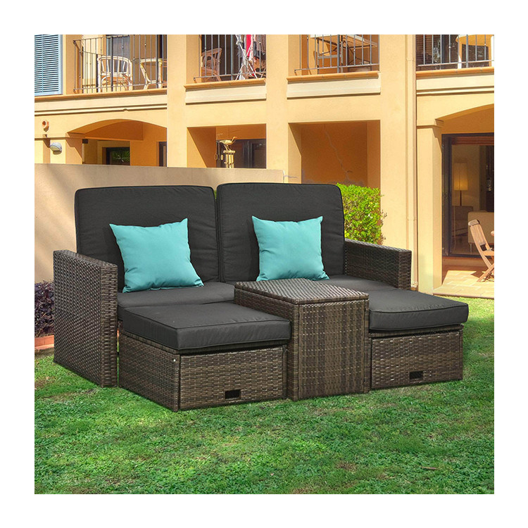 Product Dimensions | Type:PE rattan patio set Rattan:PE Wicker Rattan Frame:Steel Tube Corner Chair Size:32.25"W x 32.25"D x 33.5"H Corner Chair Weight Capacity:352lbs Coffee Table Size:27.5"W x 15"D x 19.25"H Coffee Table Weight Capacity:154lbs Ottoman Size:27.5"W x 21.75"D x 11.5"H Ottoman Weight Capacity:242lbs |