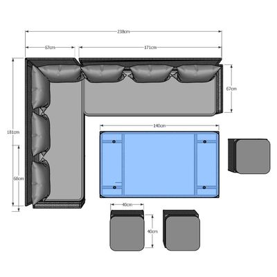 Product Dimensions | Right 3 Seater Corner Sofa Size:L182 x W67 x H78cm Left 3 Seater Sofa Size:L165 x W67 x H78cm Table Size:L139cm x W79cm x H70cm Stool Size:L40cm xW40cm x H36cm |